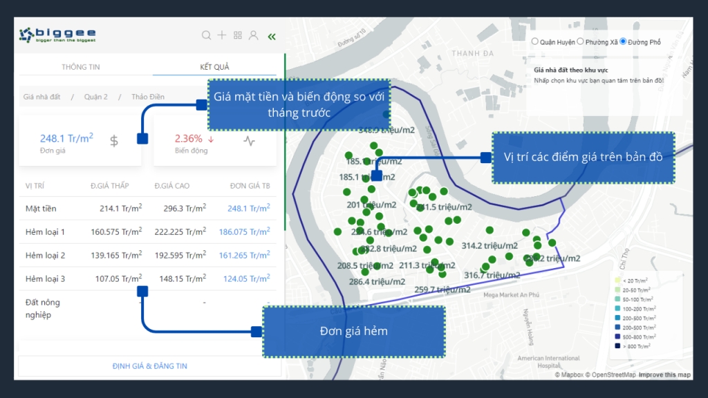 Nhấn chọn trên bản đồ: Bản đồ giá đã phân chia các khu vực với màu sắc theo đơn giá trung bình, bạn chỉ cần click chọn vào khu vực thì sẽ ra bảng giá khu vực đó. Bạn có thể thay đổi cấp khu vực ở tùy chọn góc trên bên phải màn hình.